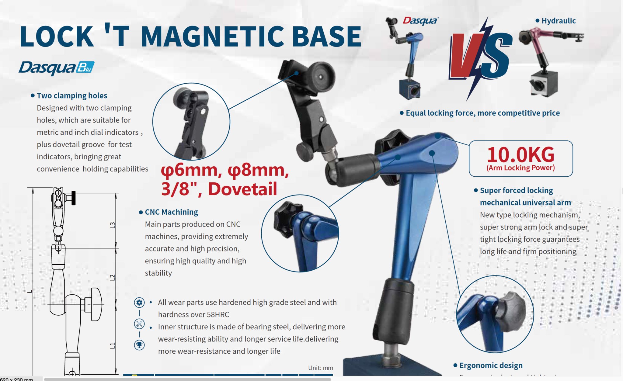 Ontworpen met twee klemgaten geschikt voor metrische en inch meetklokken, plus zwaluwstaartgroef voor test indicatoren, wat een geweldig gemak brengt van klemmogelijkheden