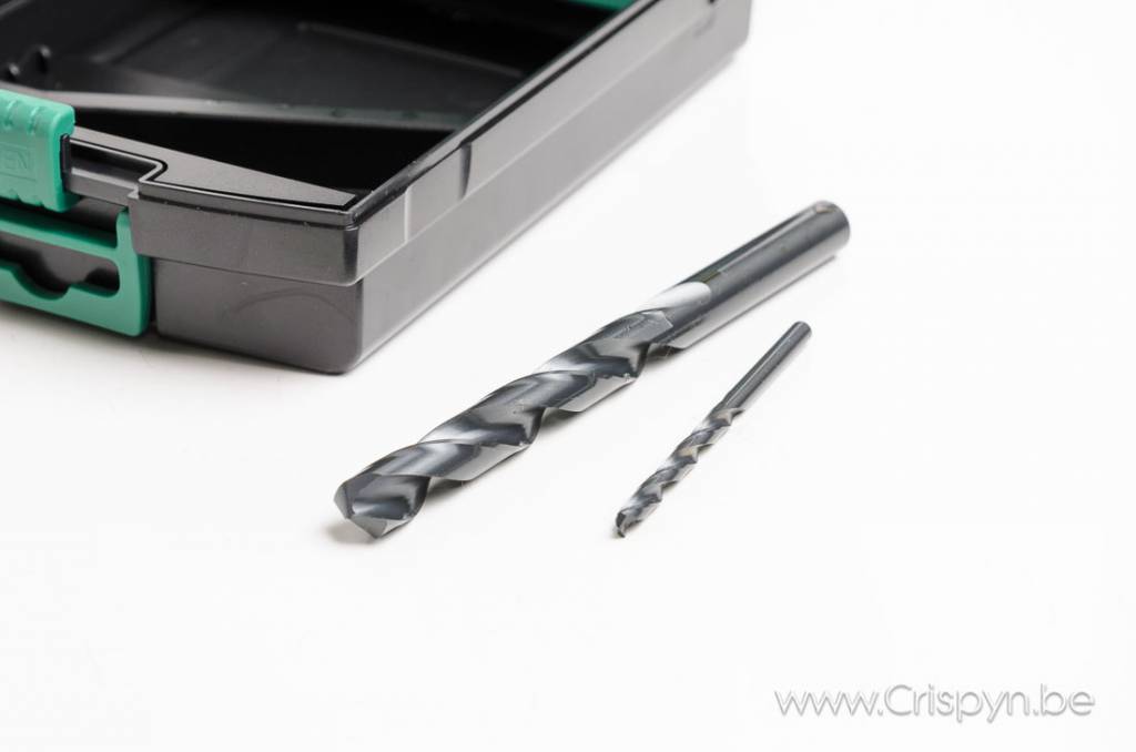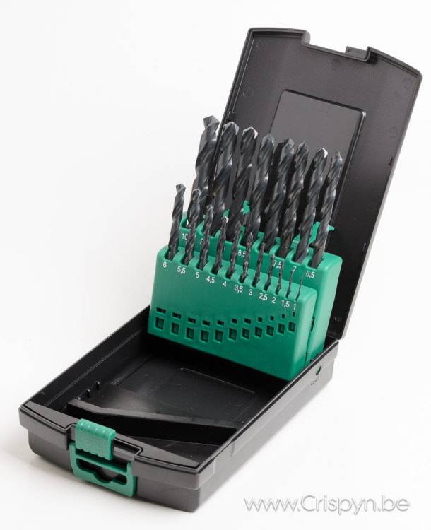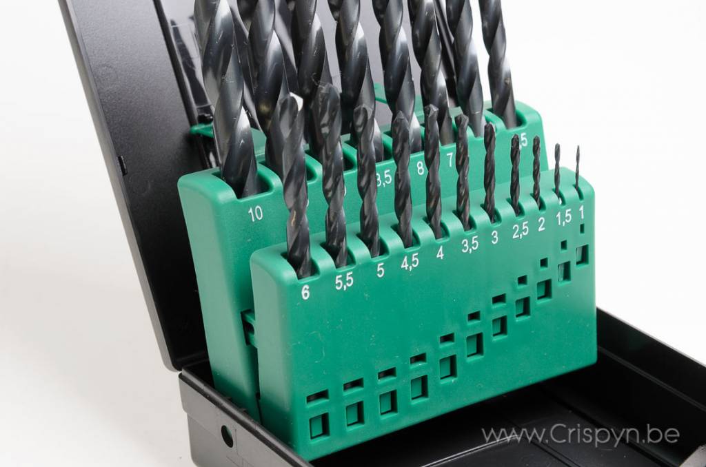 Het set is verpakt in een kunststof cassette en bevat boren van 1 tot 10 mm oplopend per 0.5 mm.