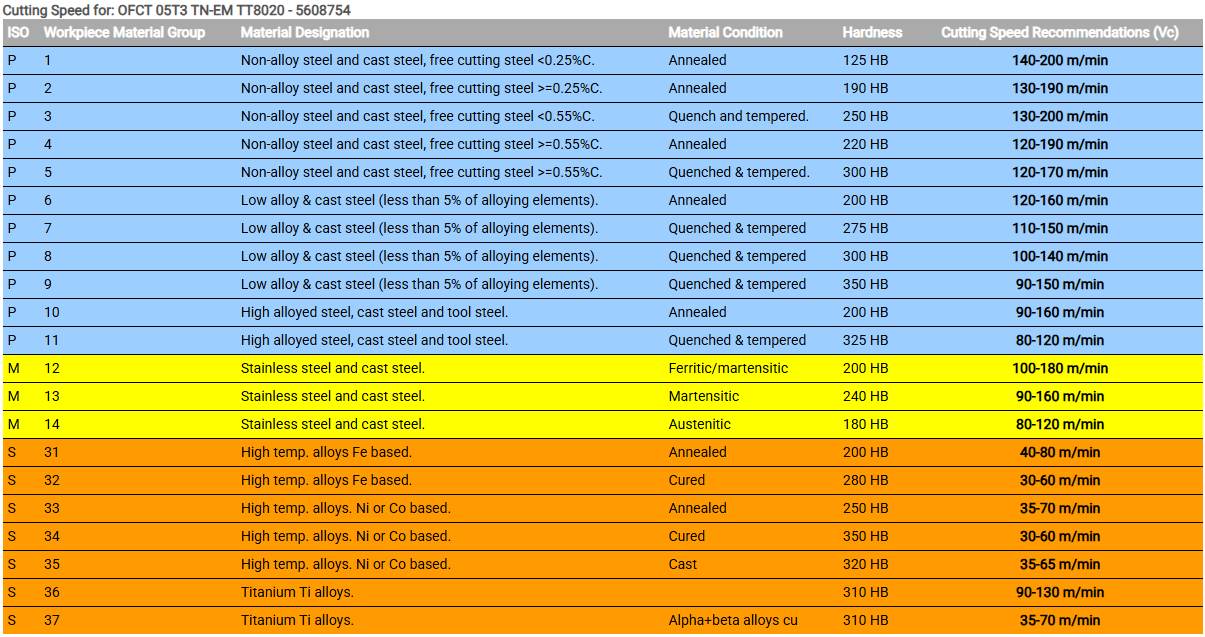 Vc: 140-200 m/min voor ongelegeerd staal tot 700N/mm²
